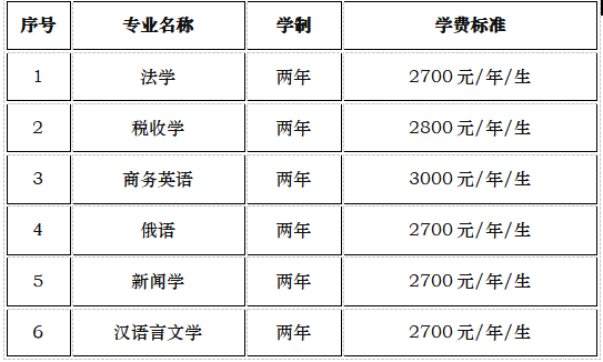 法学、税收学、商务英语、新闻学、汉语言文学、俄语(仅限中俄学院学生)。